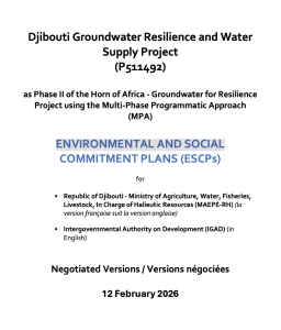 - The Republic of Djibouti (the Recipient) will implement the Djibouti Groundwater Resilience and Water Supply Project (P511492) (the Project), with the involvement of the Ministry of Agriculture, Water, Fisheries, Livestock in Charge of Halieutic Resources (MAEPE-RH1) as set out in the Financing Agreement (the Agreement). The International Development Association (the Association), has agreed to provide financing for the Project, as set out in the Agreement.